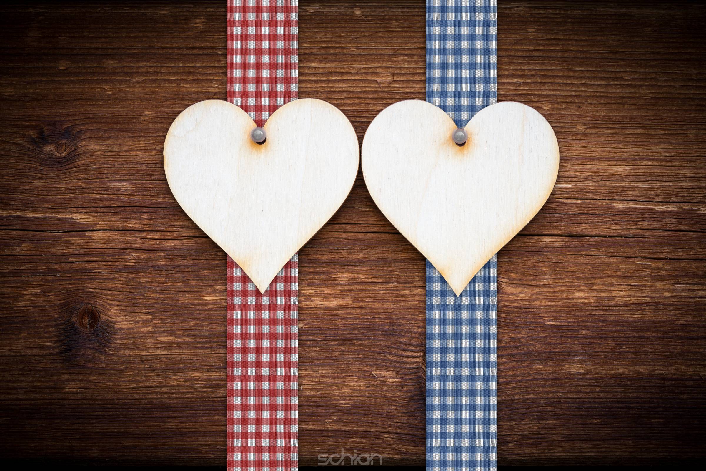 two wooden hearts on dark wood planks with red and blue ribbon