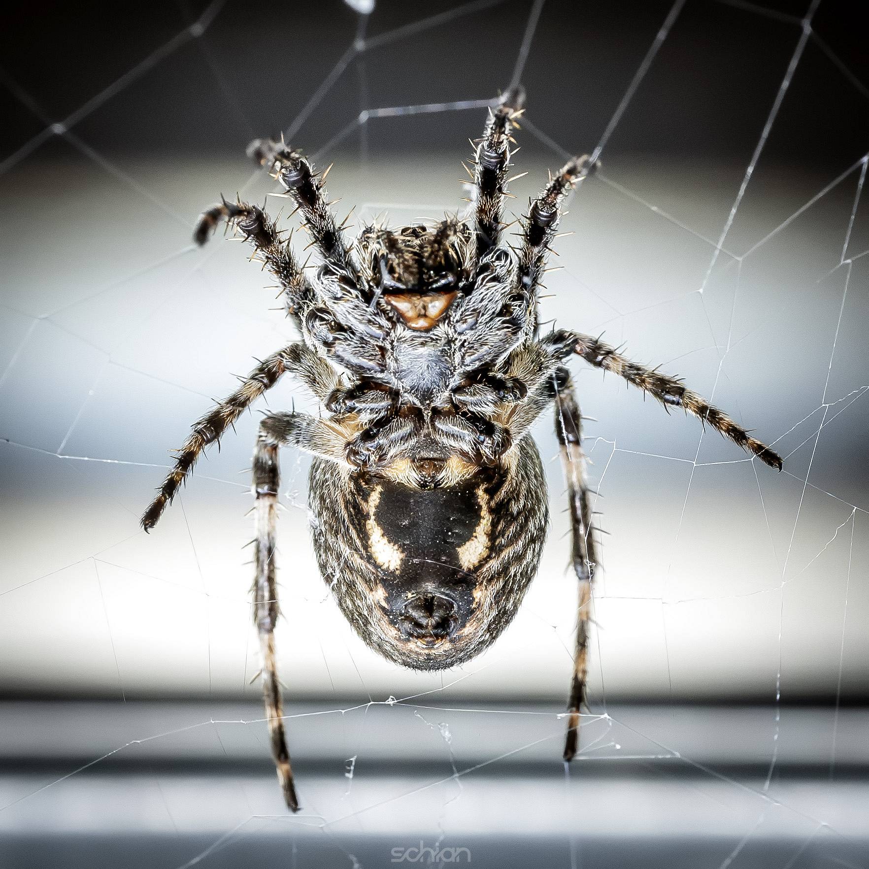 playful red-haired cat lies on the floor with black rope in front of an old wooden back wall